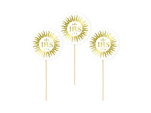 - Decorations on feather with IHS host print in gold metallized, decoration for cake or muffins.