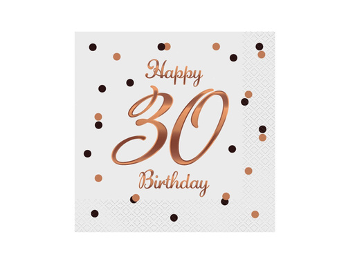 - Paper napkins in white with rose gold Happy 30th Birthday inscription. Perfect for your 30th birthday.