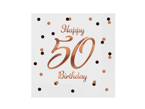 - Paper napkins in white with rose gold Happy 50 Birthday inscription. Perfect for the fifties.