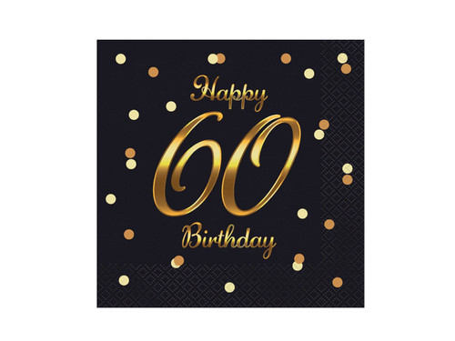 - Paper napkins in black with gold lettering Happy 60 Birthday. Perfect for a sixtieth birthday party.