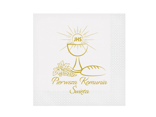 - Communion 3-ply napkins in white with gold chalice print and First Holy Communion inscription.