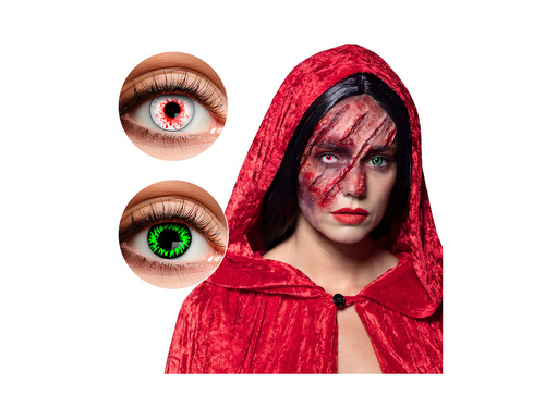 • Dwukolorowe szkła kontaktowe z motywem krwawego wilka. Okres noszenia: 3 miesiące od otwarcia opakowania.