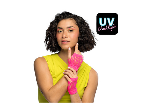 • Para krótkich rękawiczek w kolorze neonowego różu, reagujące na światło UV.