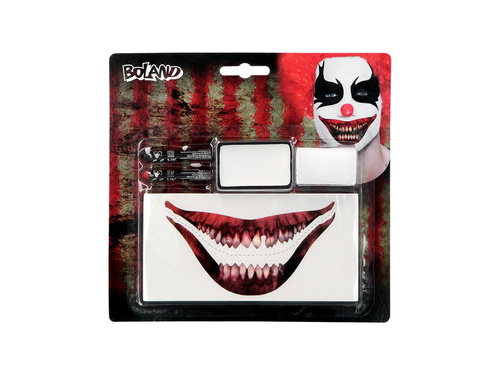- Zestaw do makijażu strasznego klauna. Zawiera naklejany tatuaż ust, farby tłuste, kredki oraz gąbkę.