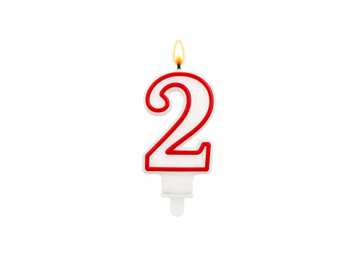 - Biała świeczka cyferka 2 "dwa" z czerwoną obwódką.