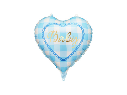 • Balon foliowy w kształcie serca z nadrukiem w niebiesko białą kratkę oraz złotym napisem Baby.