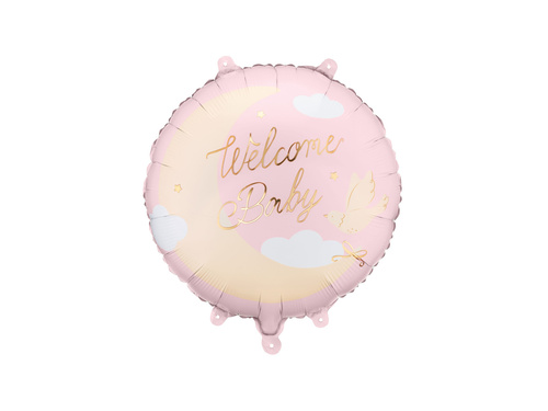 - Balon foliowy okrągły w kolorze różowym ze złotym napisem Welcome Baby.