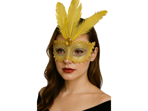 - Maska wenecka złota, opalizująca ozdobiona żółtymi piórami oraz złotym klejnotem.