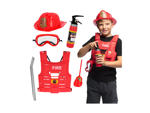 - Hełm, kamizelka, okulary ochronne, krótkofalówka, gaśnica i łom