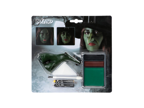 - Zestaw do makijażu wiedźmy. Zawiera nos wiedźmy, farby tłuste, gąbkę oraz aplikator.