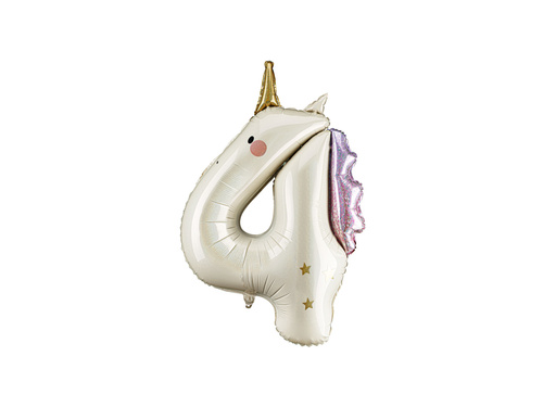 - Balon foliowy Cyfra ''4'' cztery w kolorze kremowym z rogiem oraz buźką imitującą wygląd jednorożca.