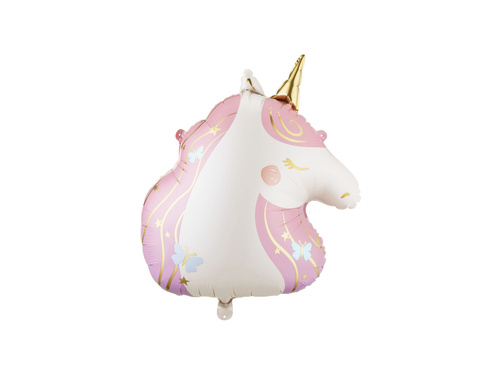 - Matowy balon foliowy w kształcie głowy jednorożca ze złotymi elementami.