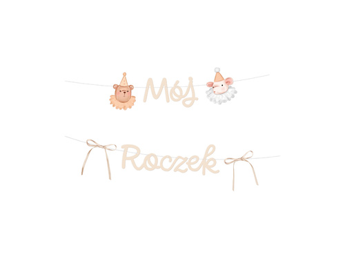 - Baner urodzinowy z napisem "Mój Roczek" w kolorze beżowym z zawieszką z misiem oraz myszką.