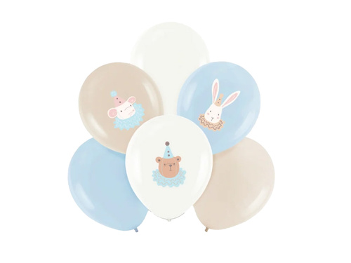 - Zestaw balonów lateksowych w pastelowych kolorach z nadrukiem myszki, królika i misia.