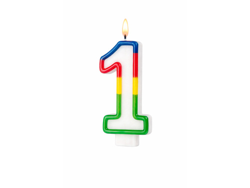 - Biała świeczka cyferka 1 "jeden" z kolorową obwódką.