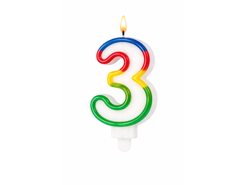 - Biała świeczka cyferka 3 "trzy" z kolorową obwódką.