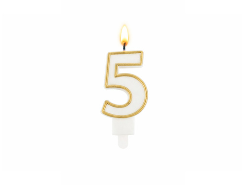 - Biała świeczka cyferka 5 "pięć" ze złotą obwódką.