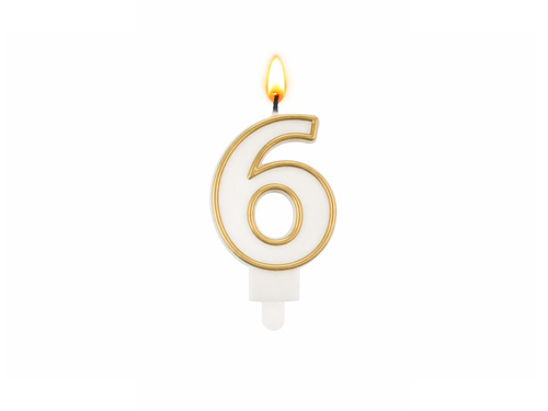 - Biała świeczka cyferka 6 "sześć" ze złotą obwódką.